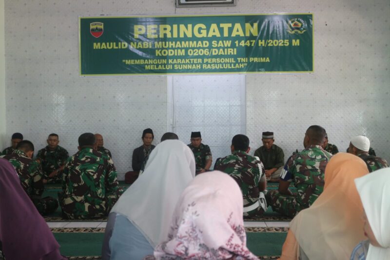 Kodim 0206/Dairi menggelar peringatan Maulid Nabi Muhammad SAW 1447 H/2025 di Musholla Al-Amin, Markas Kodim 0206/Dairi, Jalan Sisingamangaraja, Sidikalang, Kamis (18/9/2025). Acara ini mengusung tema “Membangun Karakter Personel TNI PRIMA Melalui Sunnah Rasulullah” sebagai upaya memperkuat keteladanan akhlak Nabi Muhammad SAW dalam kehidupan sehari-hari prajurit dan keluarga besar TNI.