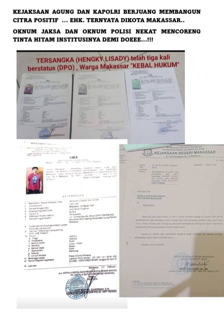 DETIKTIMUR, MAKASSAR — Di tengah upaya Kejaksaan Agung dan Kapolri membangun citra positif di mata publik, justru di Kota Makassar muncul noda hitam yang nekat ditorehkan oleh segelintir oknum jaksa dan polisi. Demi kepentingan “doee…!!!”, mereka diduga tega mencoreng institusi penegak hukum yang seharusnya berdiri tegak membela kebenaran.