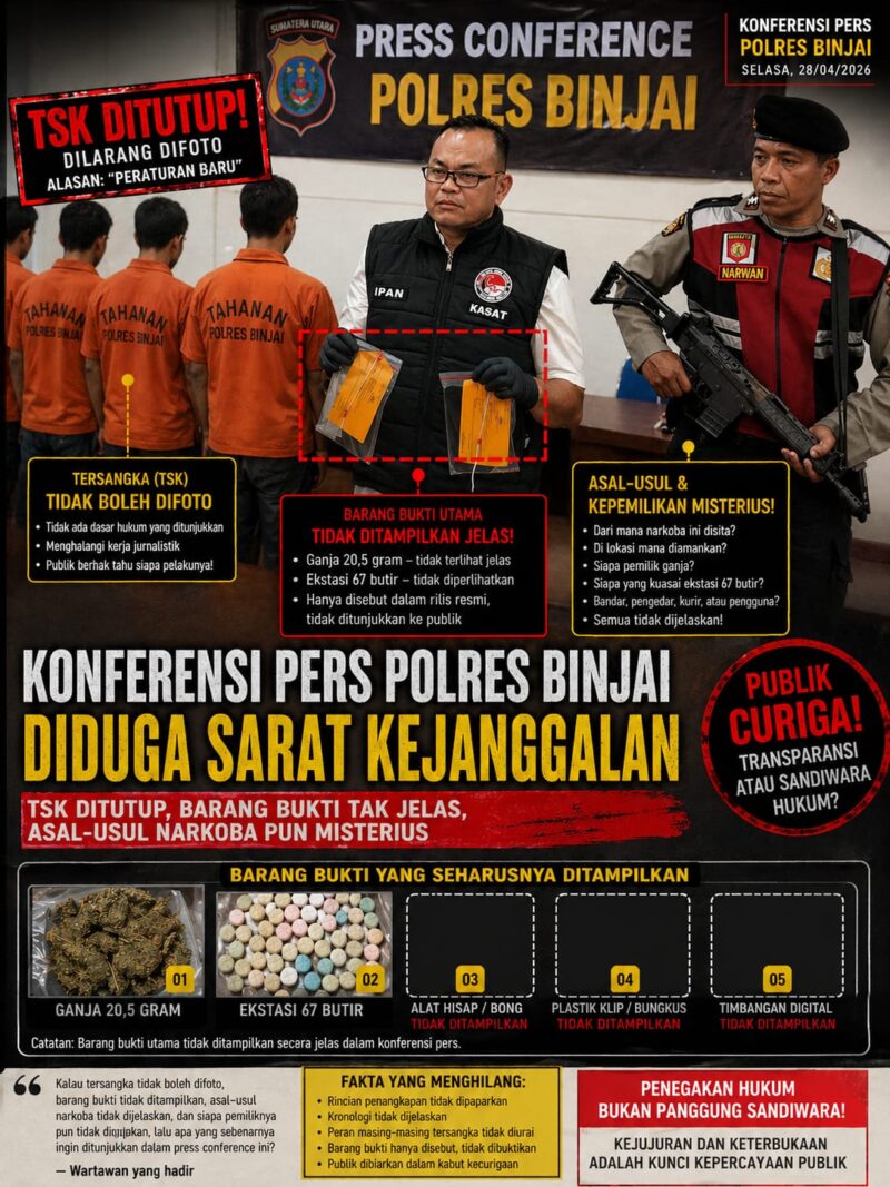 Detiktimur.net Binjai – Konferensi pers pengungkapan kasus narkotika yang digelar Polres Binjai di Aula Polres Binjai, Selasa (28/04/2026), bukannya menjawab pertanyaan publik, justru memunculkan gelombang kecurigaan baru. Alih-alih membuka fakta secara terang benderang, pihak kepolisian malah menampilkan banyak kejanggalan yang terkesan seperti upaya menutup informasi penting dari sorotan masyarakat dan awak media.